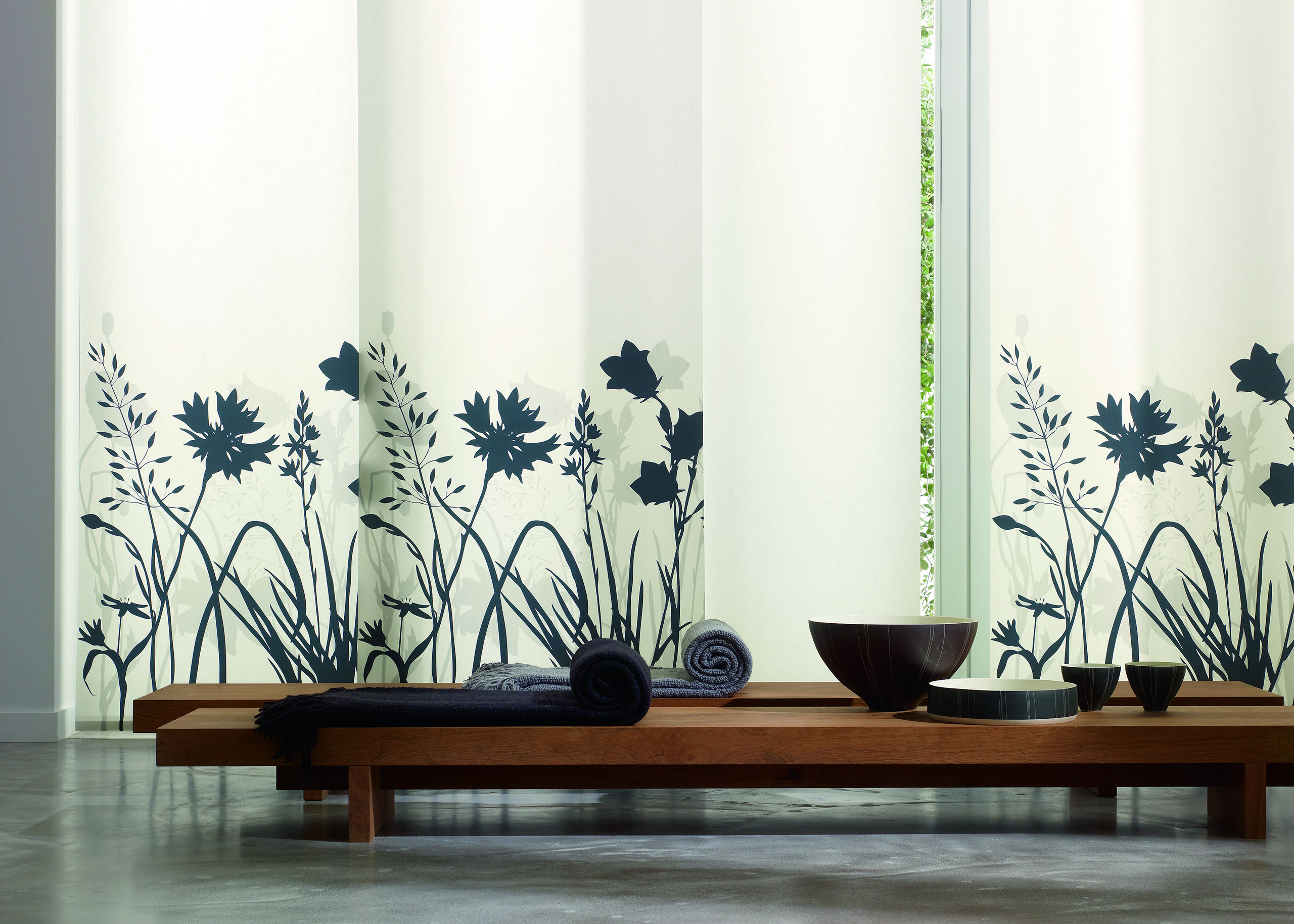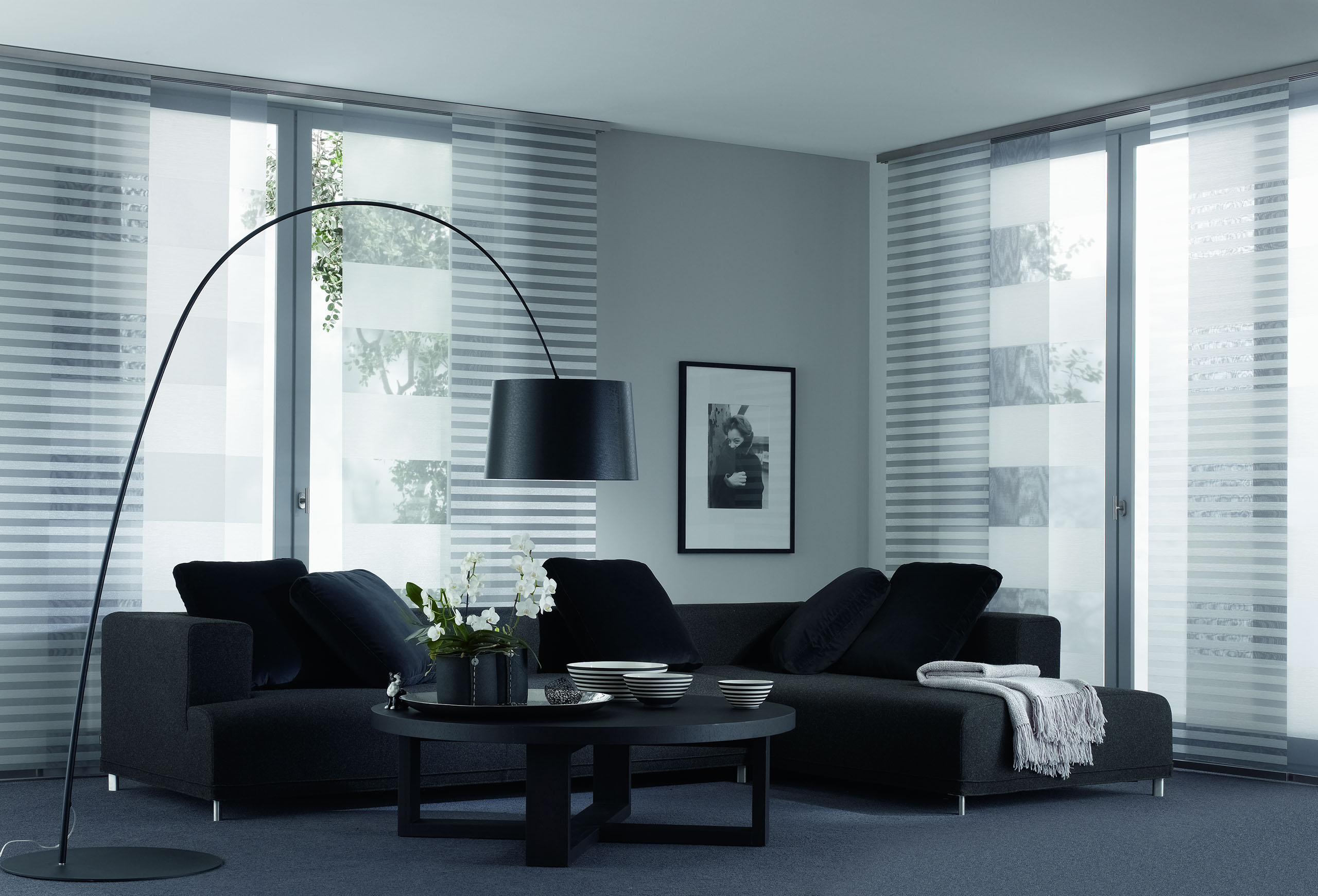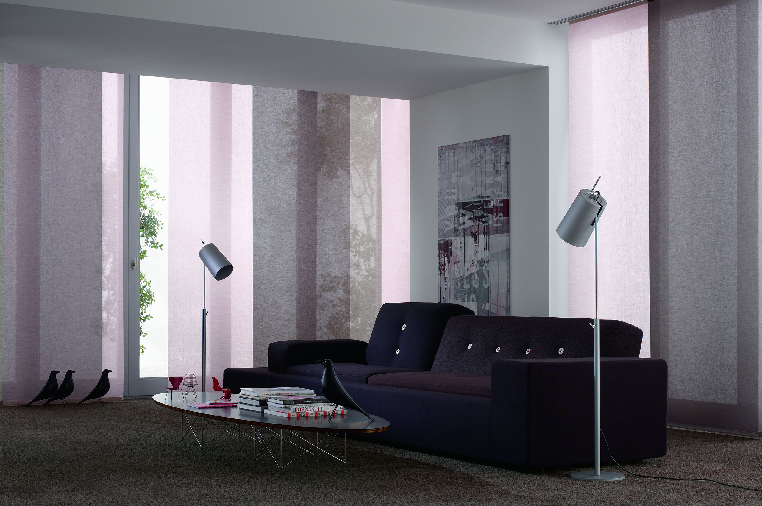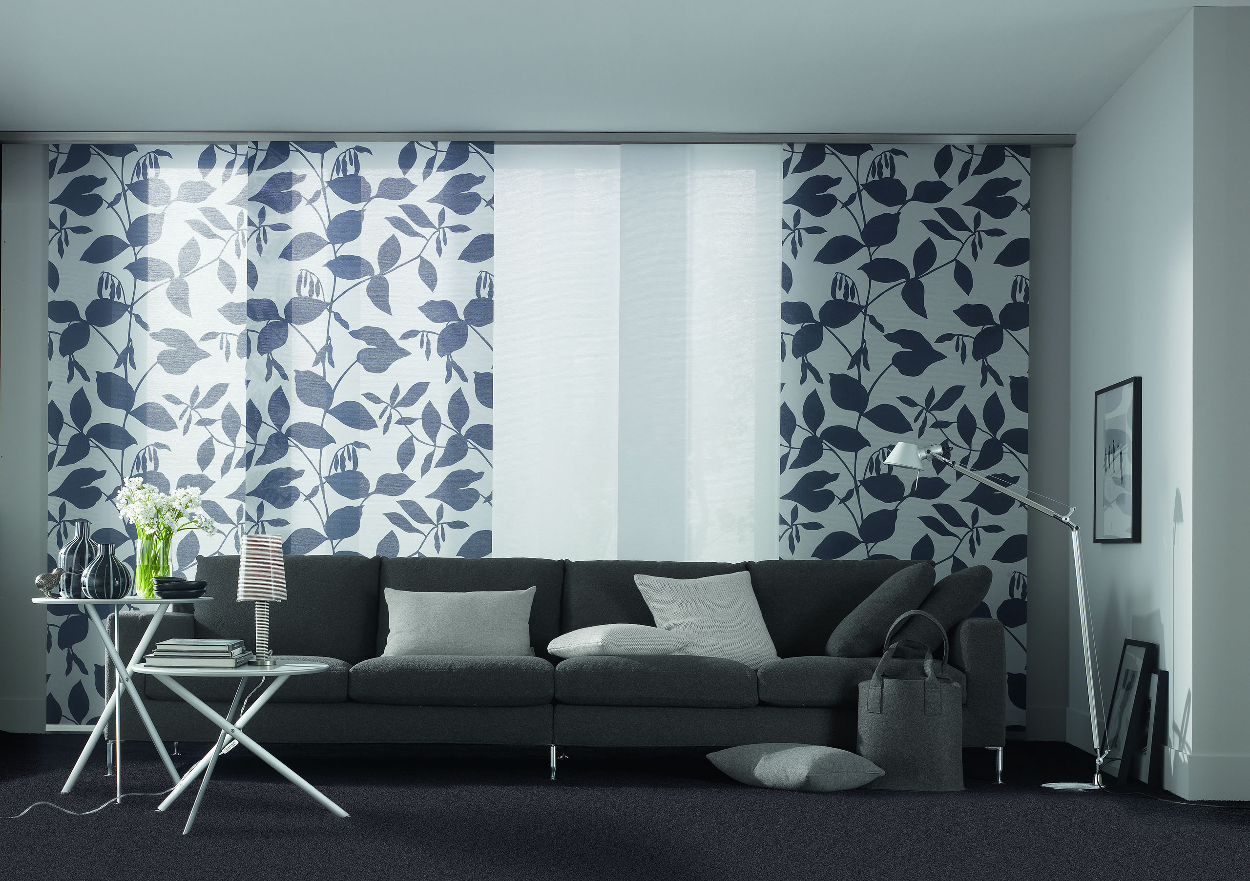 Eine reduzierte und puristische Inneneinrichtung ergänzen Flächenvorhänge perfekt. Besonders gut eignen sie sich für bodentiefe Fenster und große Fensterfronten, um den dort vorhandenen Lichteinfall zu dosieren.