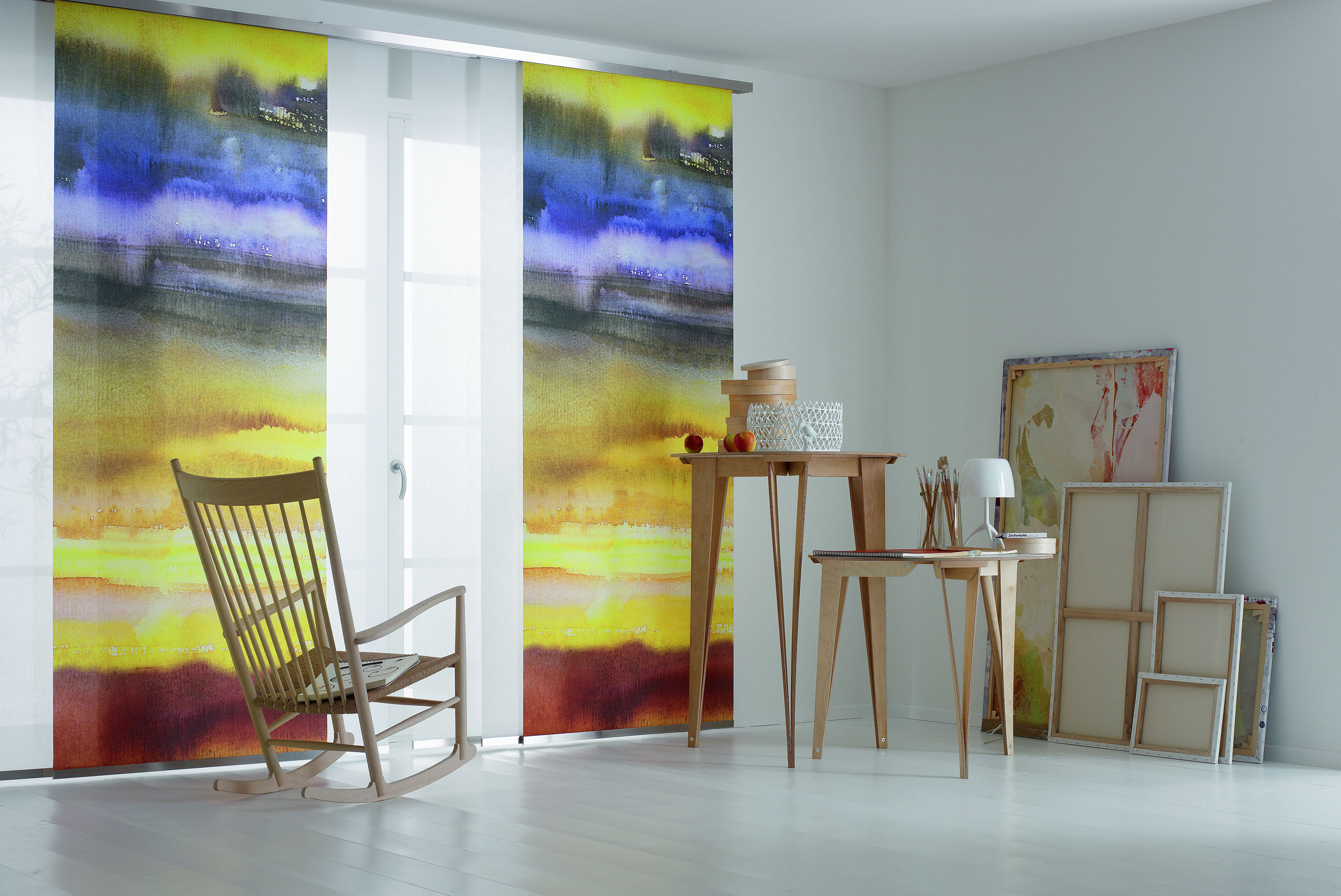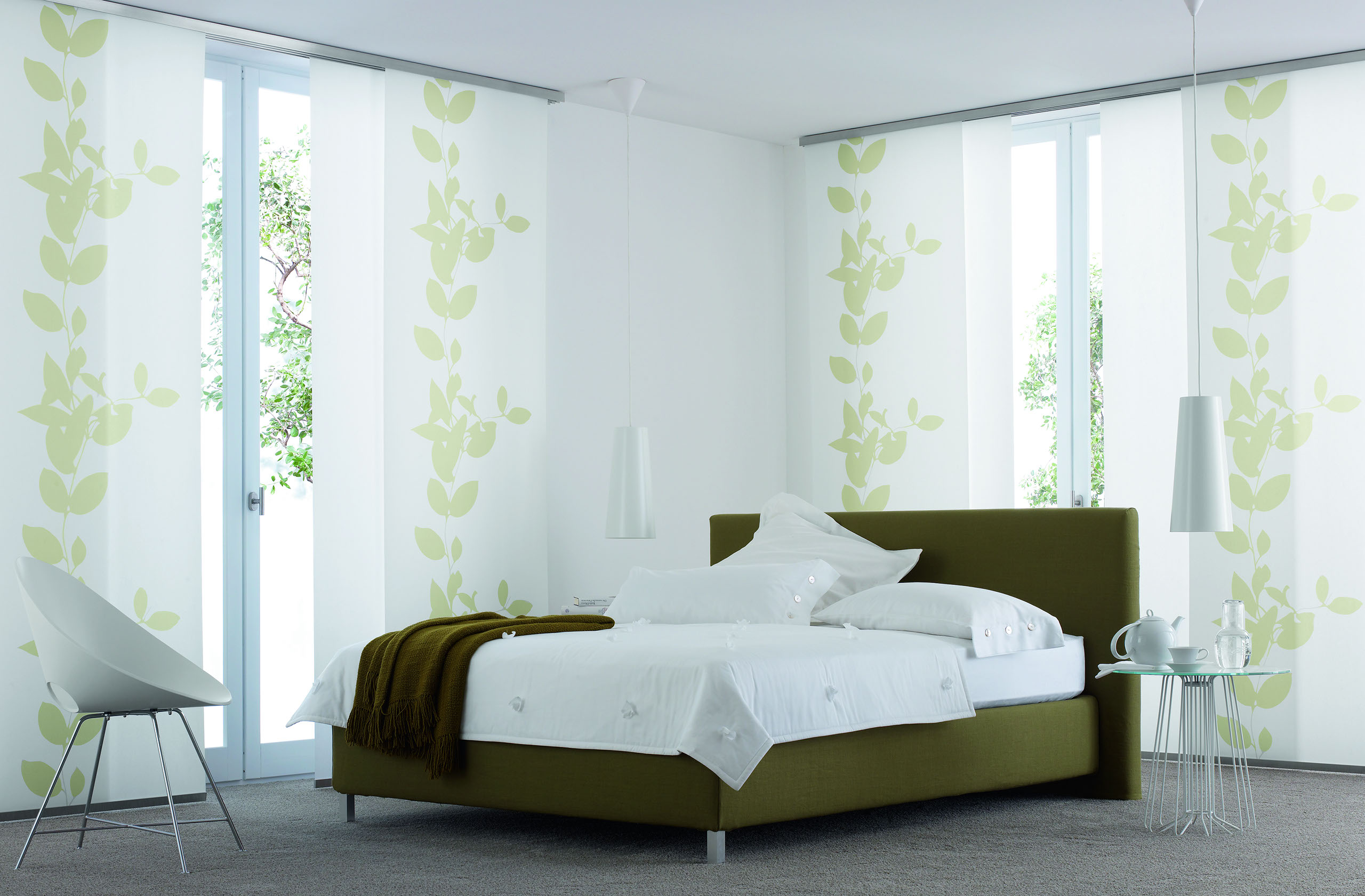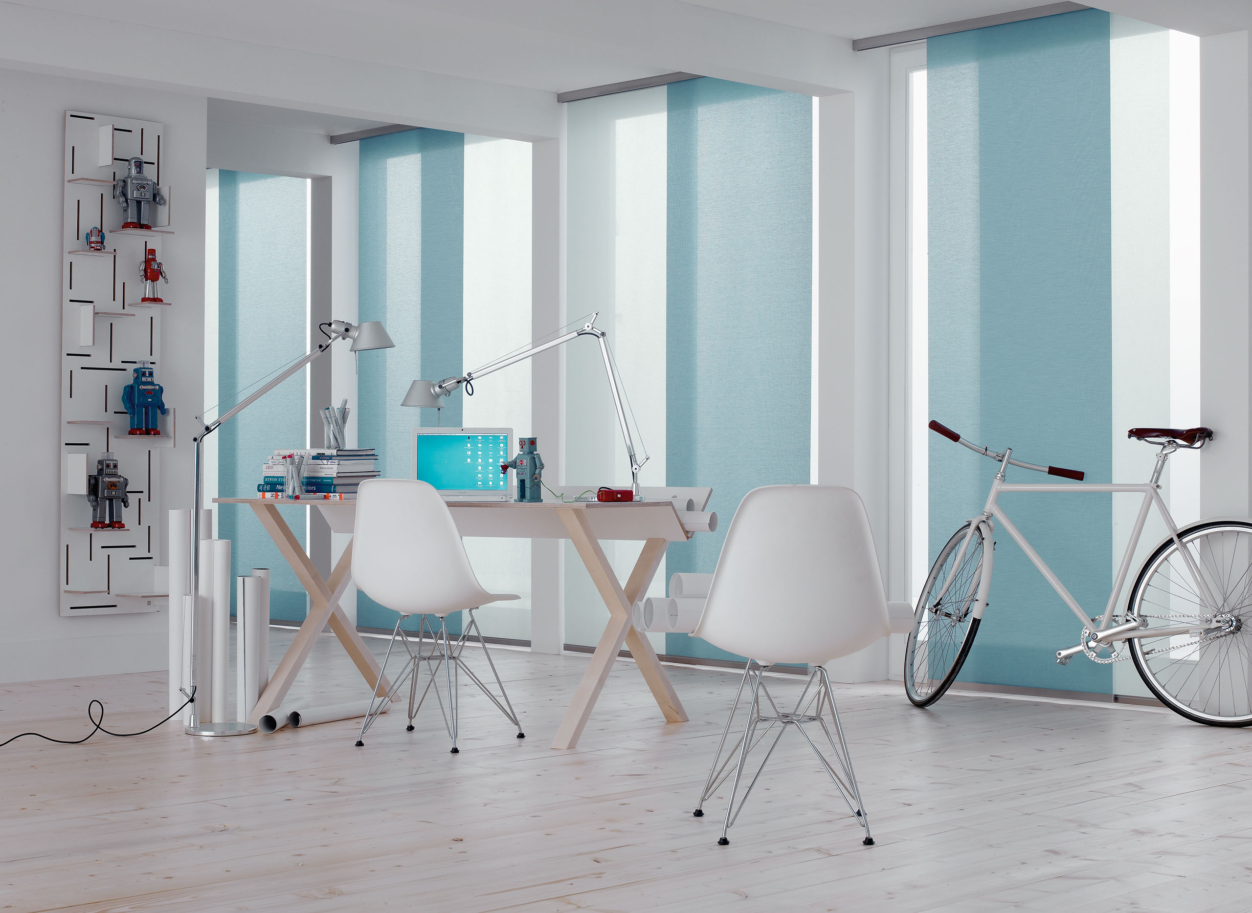 Eine reduzierte und puristische Inneneinrichtung ergänzen Flächenvorhänge perfekt. Besonders gut eignen sie sich für bodentiefe Fenster und große Fensterfronten, um den dort vorhandenen Lichteinfall zu dosieren.