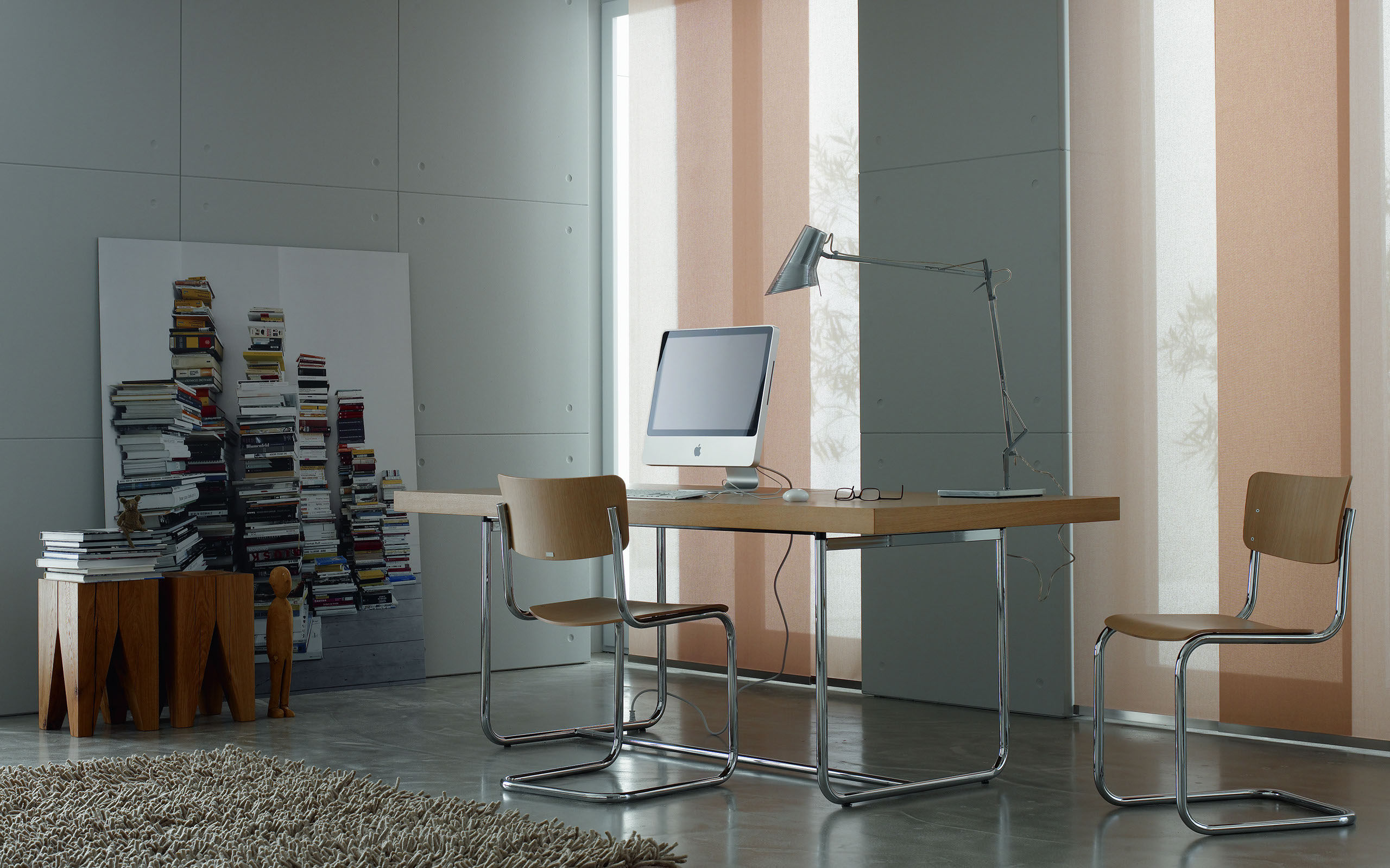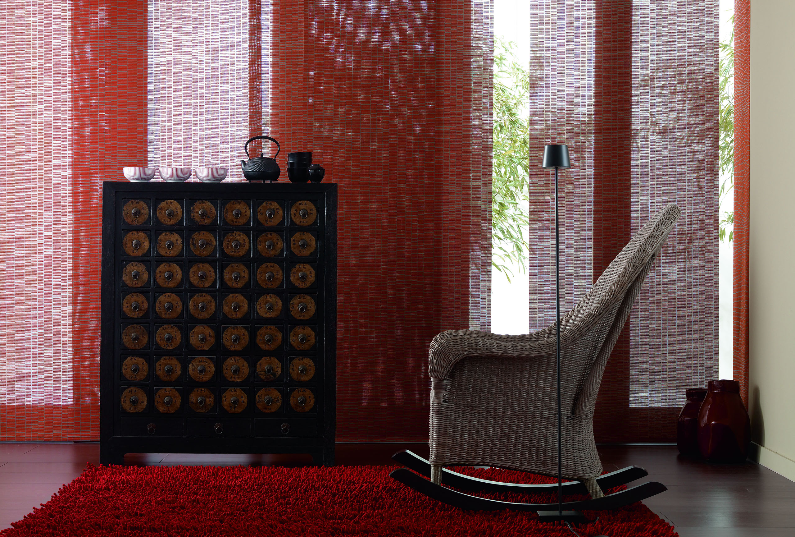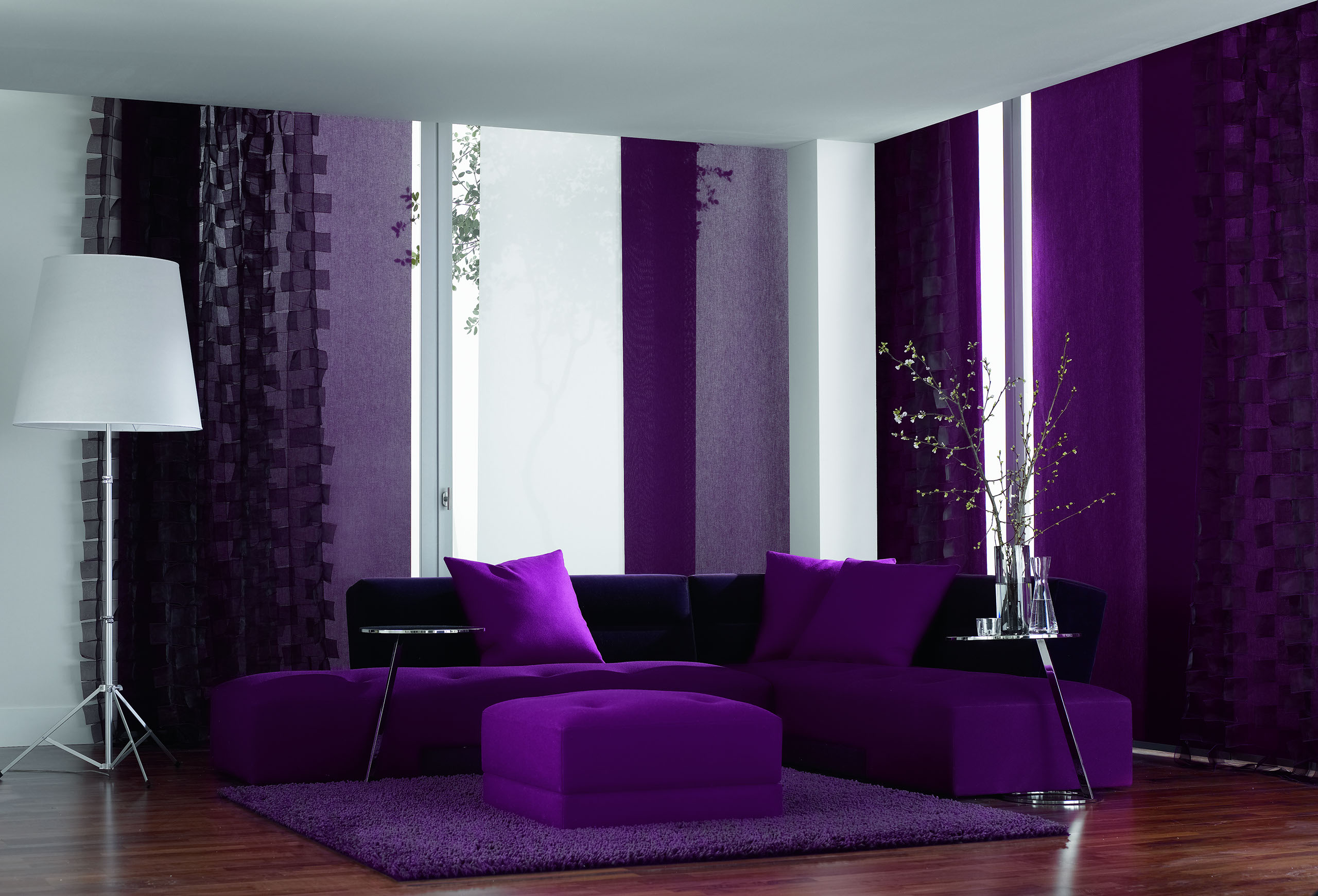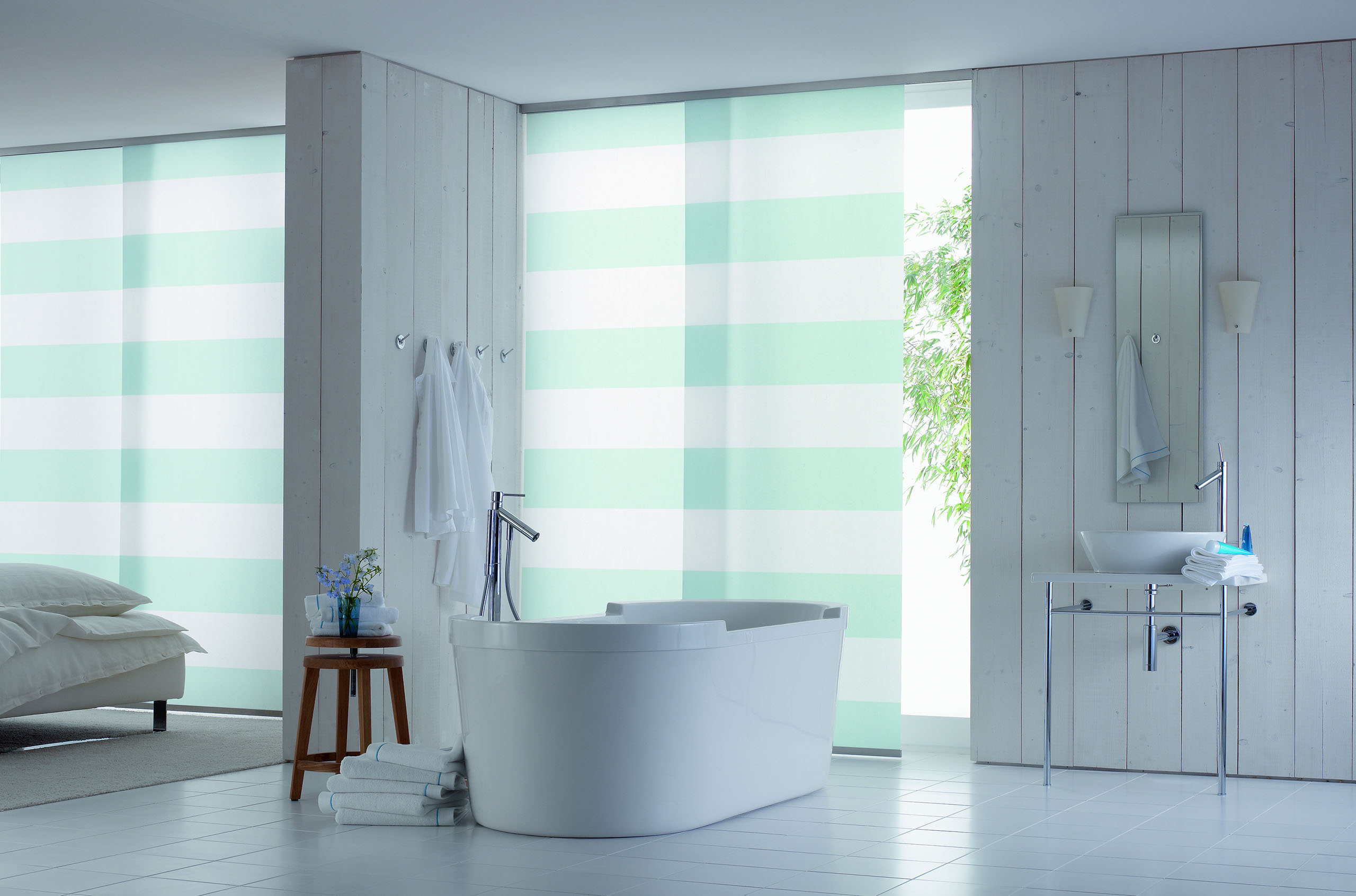 Eine reduzierte und puristische Inneneinrichtung ergänzen Flächenvorhänge perfekt. Besonders gut eignen sie sich für bodentiefe Fenster und große Fensterfronten, um den dort vorhandenen Lichteinfall zu dosieren.